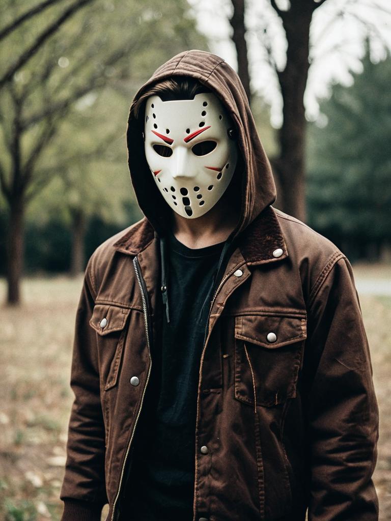 A male wearing a white slasher movie mask with red markings, dressed in a dark brown jacket with a hood and black inner shirt, standing outdoors in a blurred forest or park setting with autumnal tones.