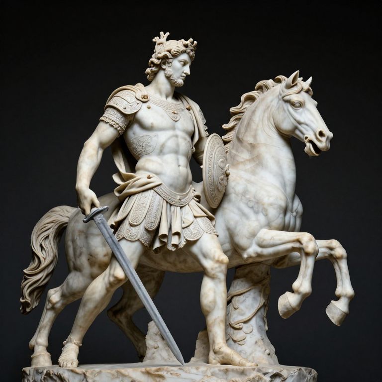 Photograph of a detailed, white marble statue depicting a muscular, bearded warrior with curly hair, wearing a detailed armor and skirt, holding a long sword in his right hand. He is mounted on a rearing, expressive horse with a flowing mane and tail. The statue features intricate carvings on the armor and horse's mane. The background is solid black, highlighting the statue's sculptural details and classical style. The warrior's confident stance and the horse's dynamic pose convey movement and strength. The sculpture is illuminated, emphasizing the texture and form of the marble.