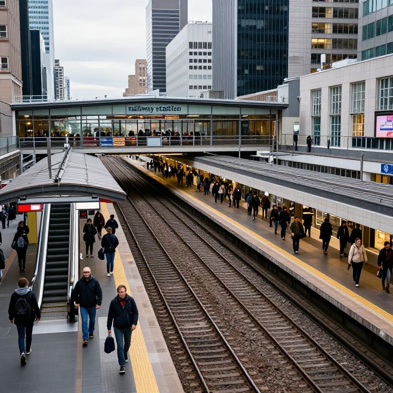 A railway station in the heart of a bustling metropolitan city, with multiple platforms, escalators, and crowds of travelers. The keyword 'railway station' captures the energy and scale of urban transit during rush hour, detailed and vibrant.