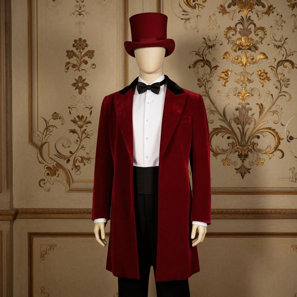 A mannequin wearing a detailed red and gold embroidered outfit, complete with a flowing red velvet coat and golden accessories, standing confidently in a modern retail store. The mannequin has a long white beard that gently falls over its chest, adding a regal and timeless charm. It wears a bright red velvet hat adorned with gold trim and a small plume, giving it a dramatic, festive appearance. The lighting is soft and warm, highlighting the rich textures of the outfit and the subtle shine of the gold details. The background is a sleek, minimalist store interior with large windows reflecting the light, creating a contrast between the ornate mannequin and the clean, contemporary space.