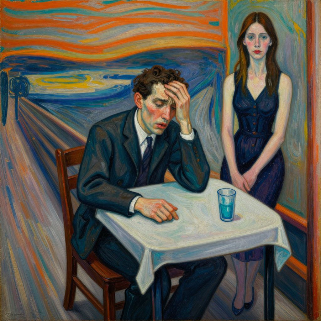 High quality high detail expressionist painting of a man in agony by lucian freud and jenny saville edvard munch and francis bacon, hd, anxiety, seated at table, turquoise and orange