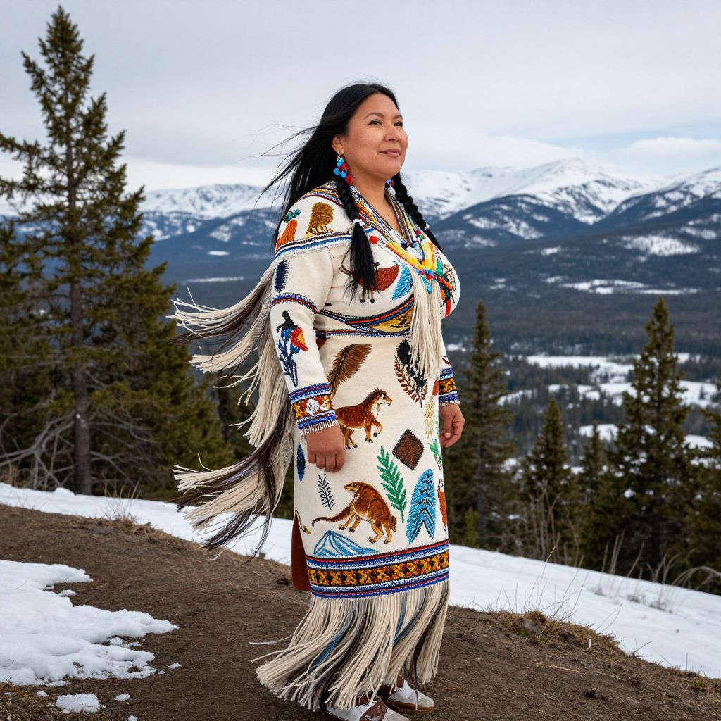 A vibrant, outdoor portrait of a Canadian Indigenous woman in a full-feathered and fringe-bead costume standing on a snow-dusted ridge, her face strong and grounded with a subtle smile, wearing a long wrap-style dress with beaded patterns representing local wildlife and plant life, the wind lifting the fringe as she turns to face the horizon, surrounded by pine trees and snow-covered mountains, blending cultural identity with the Canadian wilderness.. The woman has big tits and cute face