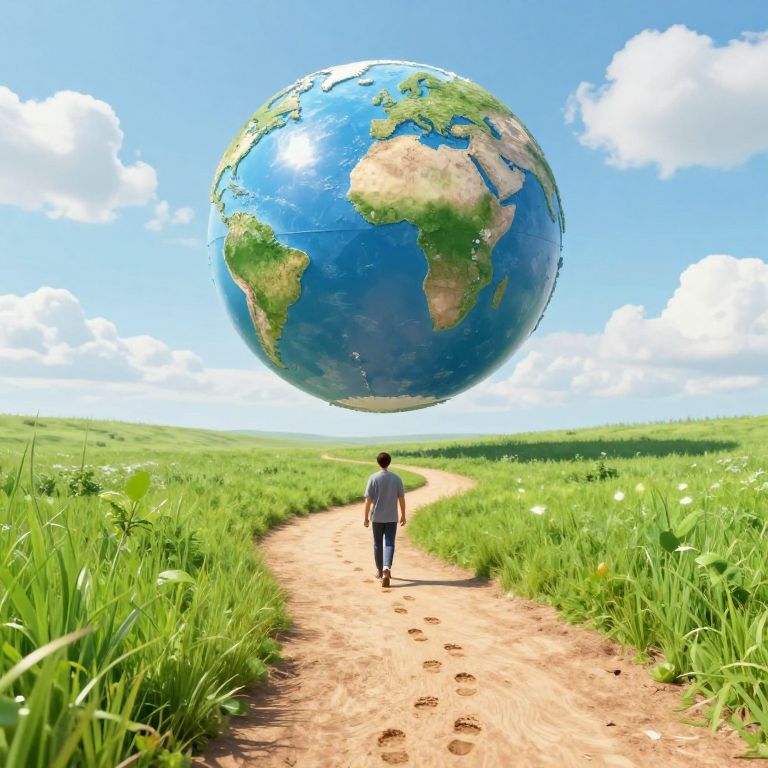 A surreal 3D-rendered scene depicts a lone figure walking along a winding dirt path through a vibrant meadow, leaving reversed footprints that trace a return journey, set against a backdrop of a massive, detailed globe floating in a bright, cloud-dotted sky.