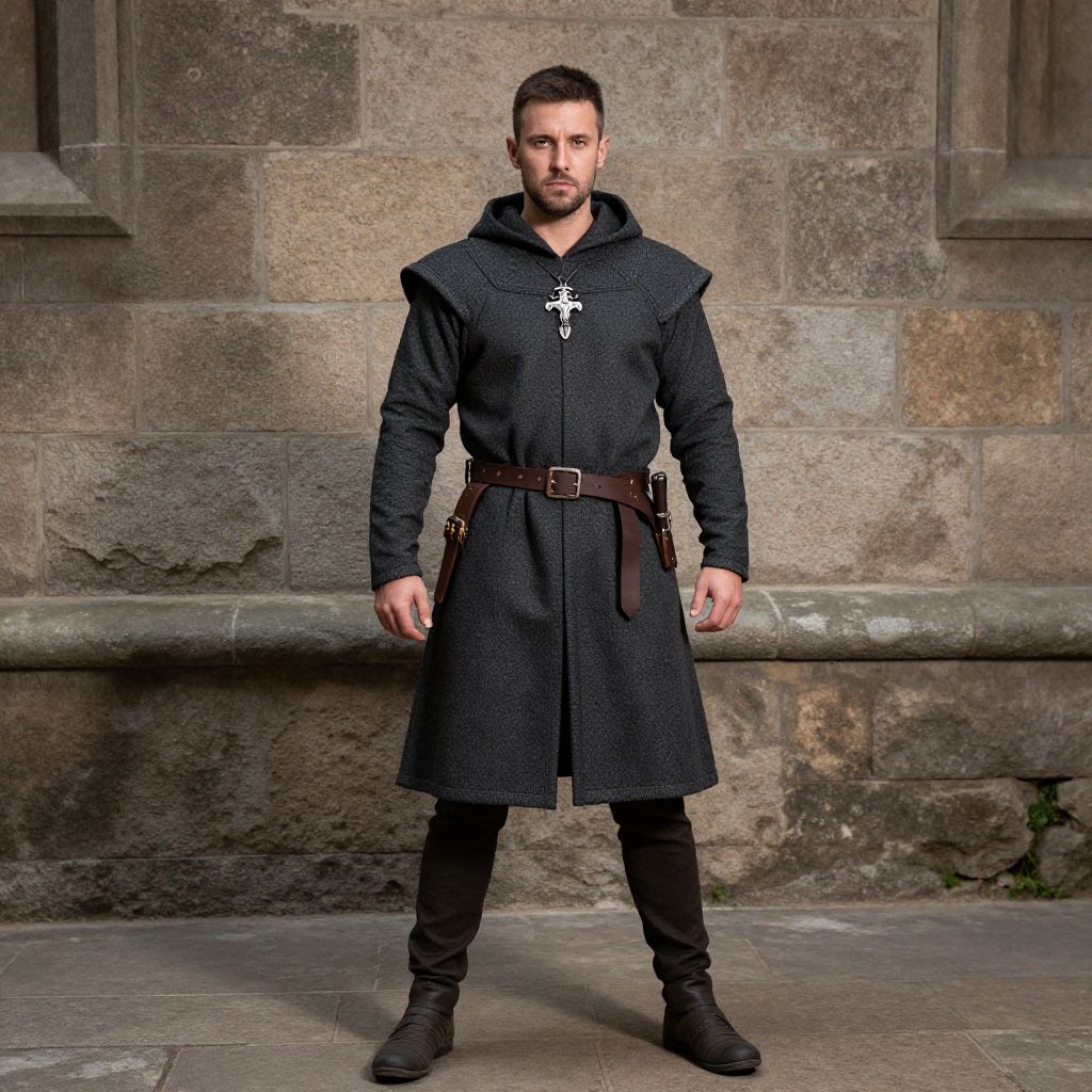 Larp Rogue Costume, man dressed in medieval clothing standing in front of a stone wall