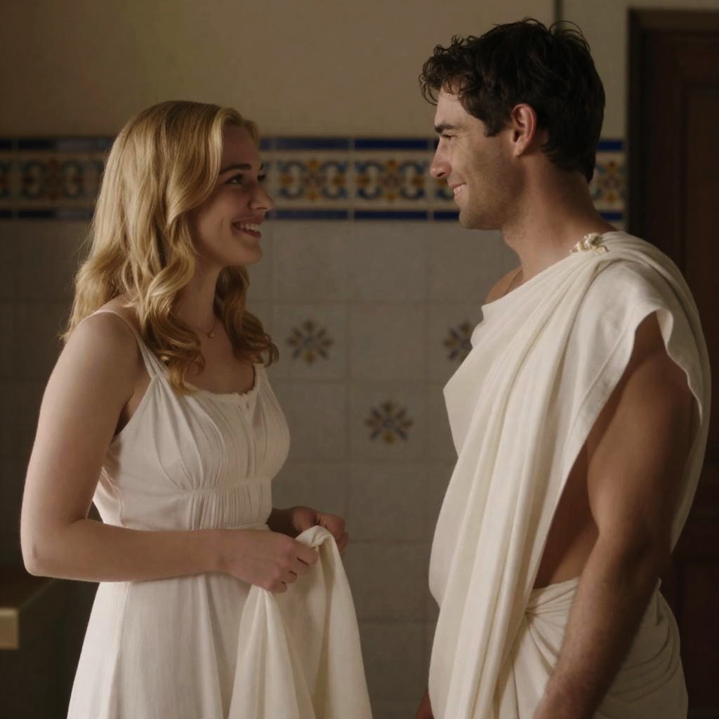 Photograph of a movie still with two people. Blonde woman with fair skin, white dress, smiling, holding white fabric. Man with dark brown hair, white toga-like garment, smiling, facing her. Background has tiled wall with ornate patterns. Woman on left, man on right. Both looking at each other. Warm, indoor setting.