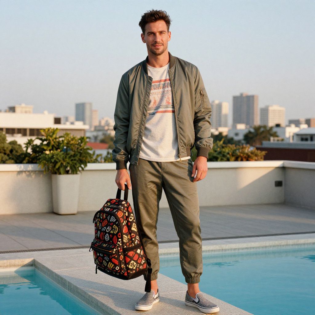 A man, lightweight bomber jacket, vintage band tee, tailored joggers, slip-on canvas shoes, bold patterned backpack, sun-drenched rooftop pool, city skyline backdrop, medium format film, relaxed smile, carefree vibe. Man has masculine face and piercing eyes