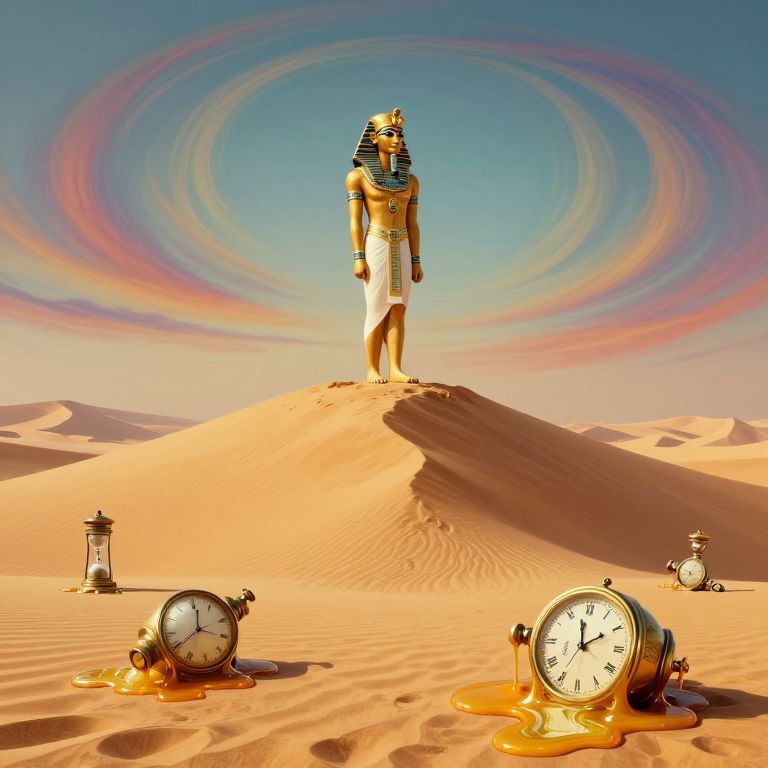Visualize an otherworldly landscape where an ancient pharaoh stands atop a majestic sand dune under a sky of swirling hues. The pharaoh, with meticulous attention to detail and adorned in gold, surveys his domain from an impossible vantage point. Surrounding him are melting timepieces that drip like molten wax onto the golden desert floor, blending the grandeur of ancient Egypt with surrealistic whimsy, evoking a sense of timelessness and wonder in this dreamlike scene reminiscent of Salvador Dali's iconic style.
