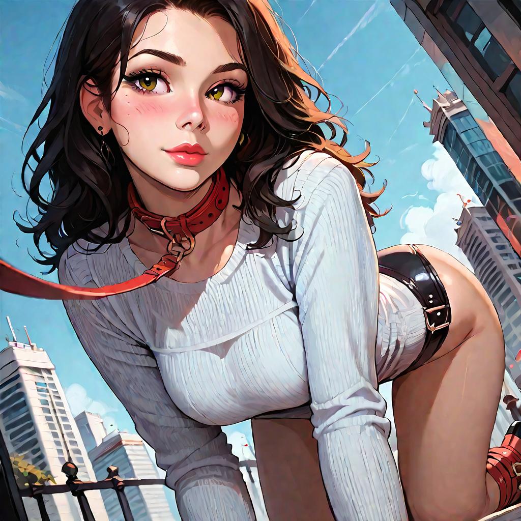 Digital artwork of a curvy young woman with light skin and green eyes, wearing a tight white ribbed top, black bondage-style shorts, and a red animal collar with leash. The image is set in an urban street environment with tall modern buildings under a clear blue sky. The woman is posed on all fours with a slight smile, captured using a dynamic dutch angle. The style is a polished digital painting with perfect lighting, highlighting the soft texture of her hair and skin.
