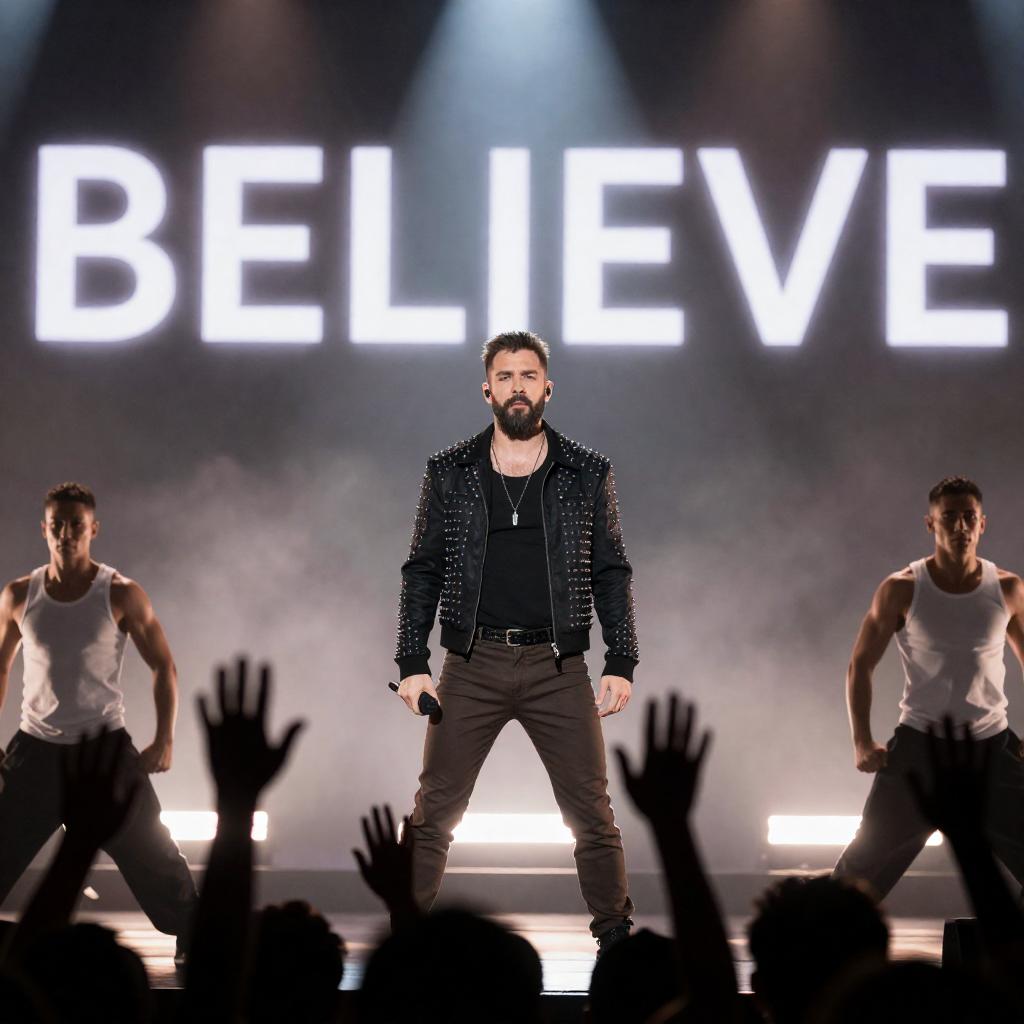 Male singer in center, wearing black studded jacket, brown pants, and beard, stands on stage. Large illuminated "BELIEVE" sign in background. Silhouetted crowd with raised hands, two male dancers in white tank tops on left and right. Bright stage lights, mist effects. Intense expression on singer's face.