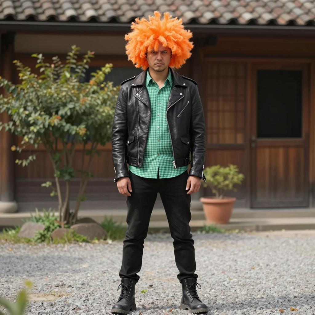 Hilarious costume guy, photograph of a man standing outdoors, daytime, wearing a black leather jacket, green checkered shirt, black pants, black boots, and a large, bright orange wig with wild hair, serious expression, background includes a wooden building with a tiled roof, green bushes, and a potted plant, gravel ground, sunny, realistic style, modern casual fashion, man's hands resting by his sides, front-facing camera, no s, full-body shot