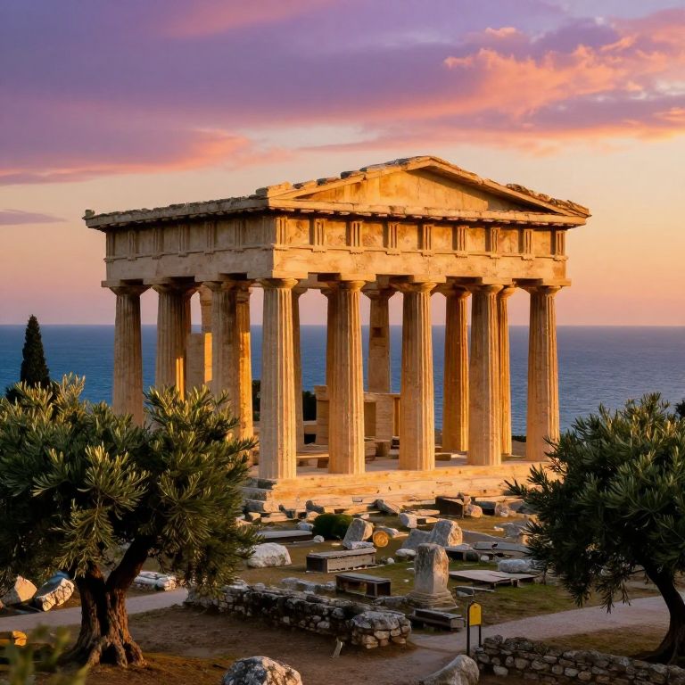 Apollo's ancient temple ruins bathed in golden sunset light, surrounded by lush olive trees and sparkling Mediterranean sea under a vibrant sky, detailed classical Greek architecture, cinematic atmosphere, ultra-realistic rendering