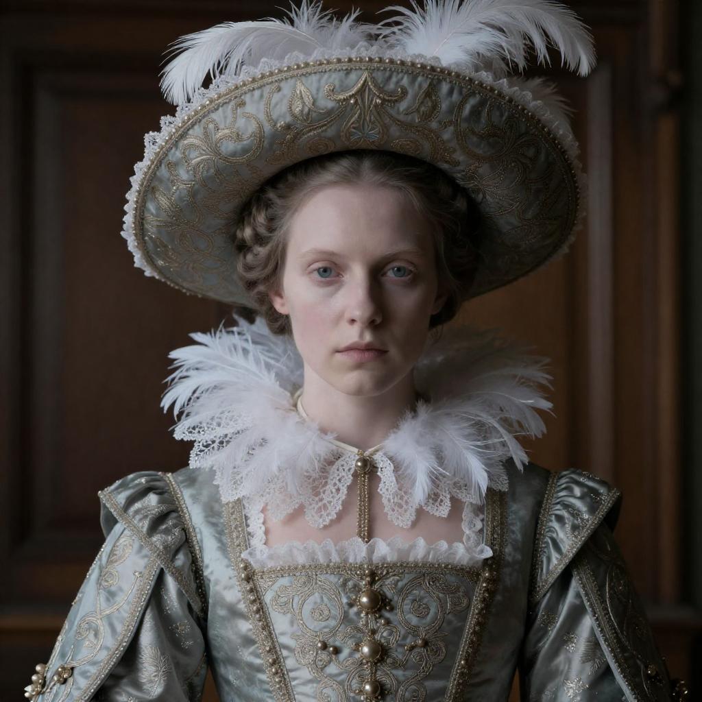 Photograph of a pale-skinned woman in an elaborate Renaissance-style dress with intricate silver embroidery and a large, ornate feathered hat. She has a serious expression, wearing a lace collar with white feathers. The background is dark and wooden.