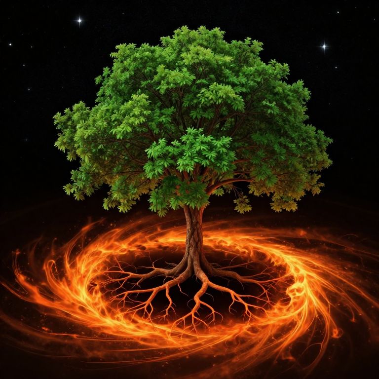 A solitary tree stands upright amidst a cosmic expanse, its vibrant green foliage contrasting sharply against the star-studded night sky, while its intricate root system spirals outward in fiery orange rings, encircling a deep, dark void that hints at the mysteries of the universe.