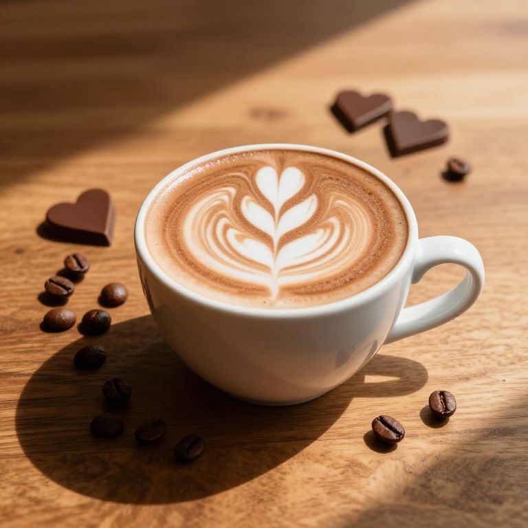 A creative composition featuring mochas with intricate latte art, chocolate hearts and coffee beans scattered around, set on a wooden table with sunlight casting dynamic shadows, emphasizing the rich textures and inviting aroma of the drink.