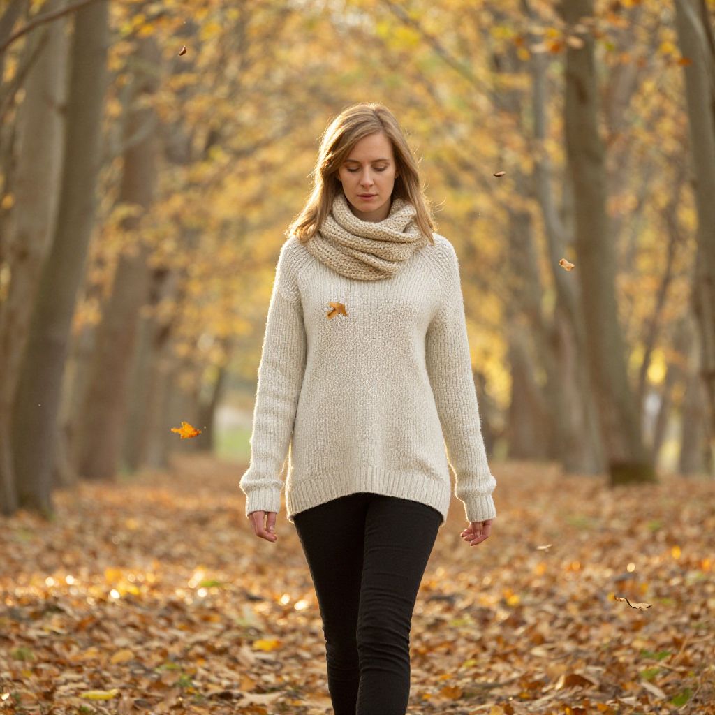 Photograph of a young woman with light brown hair, wearing a cream knit sweater, beige scarf, and black jeans, walking through a sunlit autumn