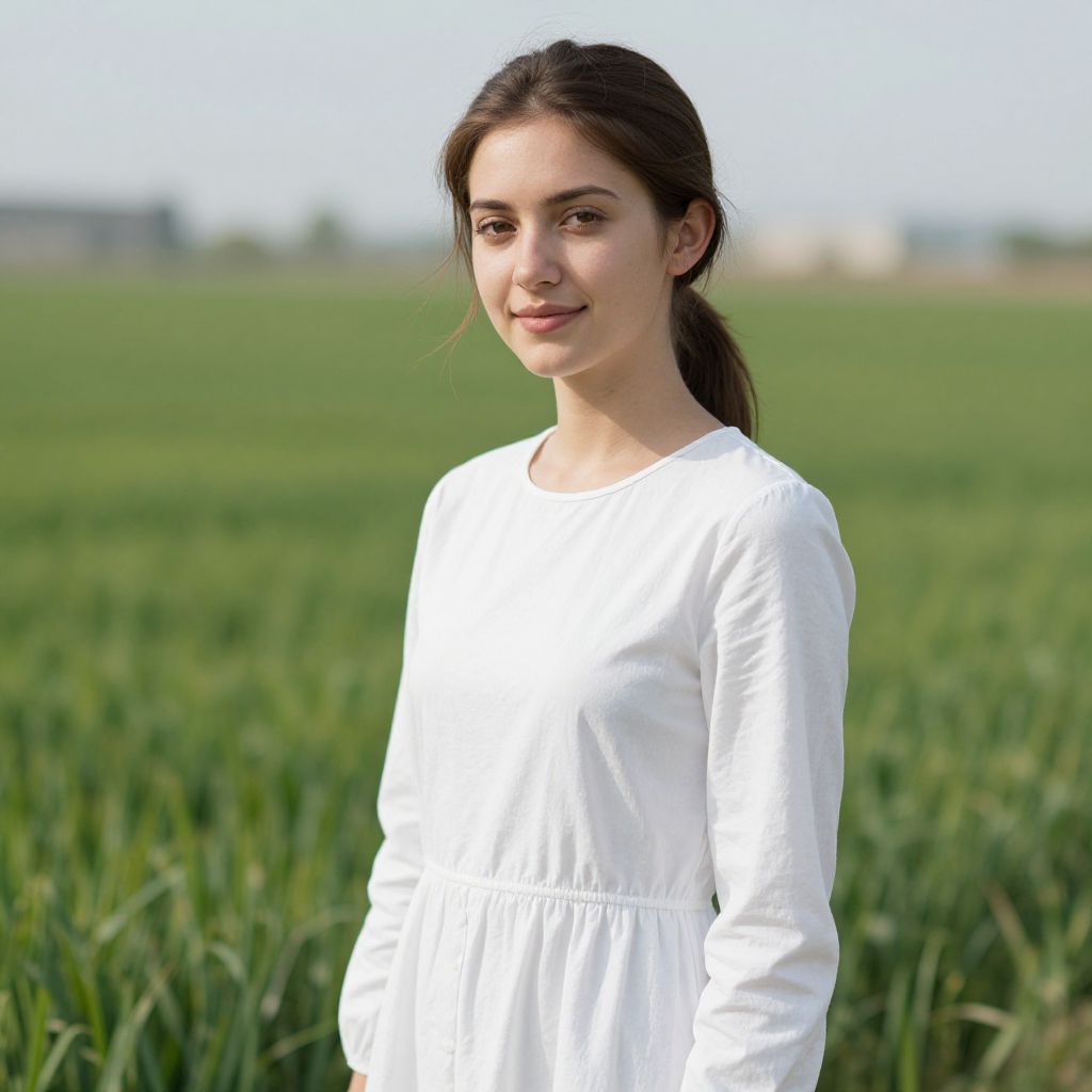 Organic cotton woman, 1girl, solo, realistic, brown hair, looking at viewer, white dress, dress, ponytail, smile, lips, long sleeves