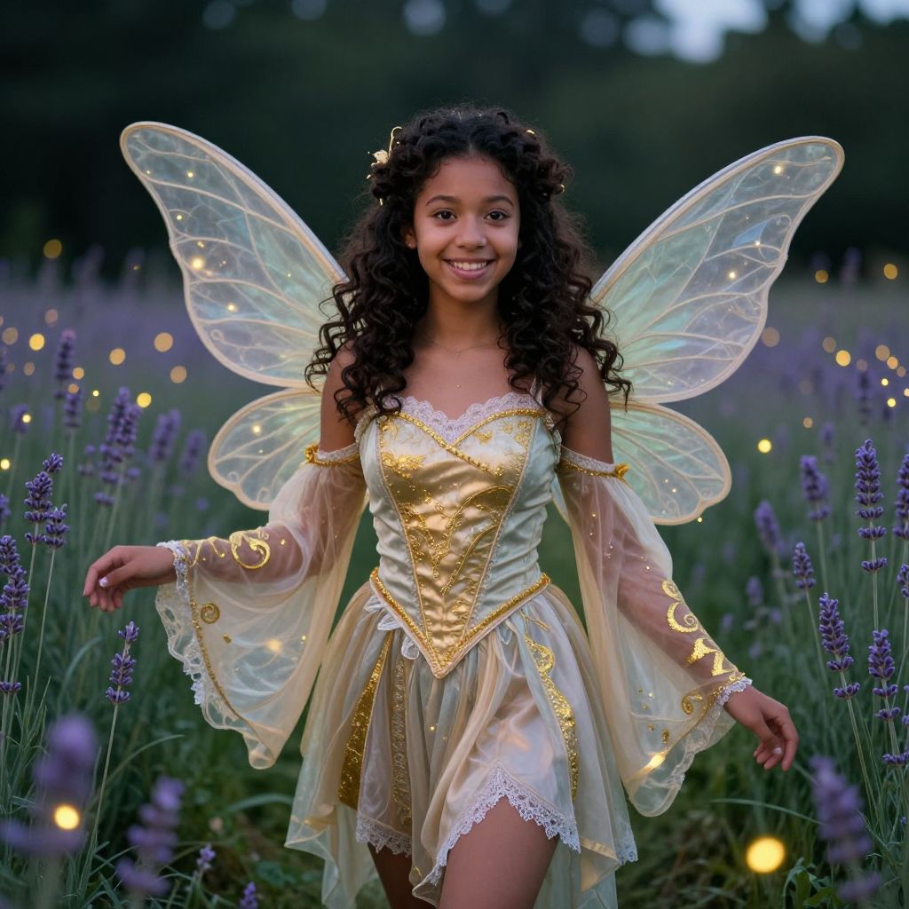 A teenage girl with warm brown skin, curly black hair, and a friendly smile dressed in a fairy costume with long, flowing sleeves painted with golden details, standing in a magical meadow during a spring evening, surrounded by glowing fireflies and wild lavender blooms, the fairy outfit with a lace-trimmed bodice and a butterfly-winged veil.