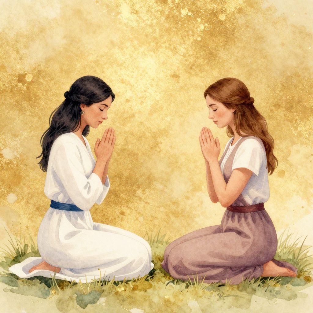 Digital painting of two women kneeling on grass, facing each other with hands in prayer. The woman on the left has long black hair, wears a purple dress with short sleeves, and has a light brown skin tone. The woman on the right has long brown hair, wears a white dress with a blue belt, and has a fair skin tone. Both have closed eyes and serene expressions. The background is a golden, textured gradient, creating a warm, spiritual ambiance. The grass at the bottom is green and slightly detailed. The style is realistic with a soft, painterly quality.