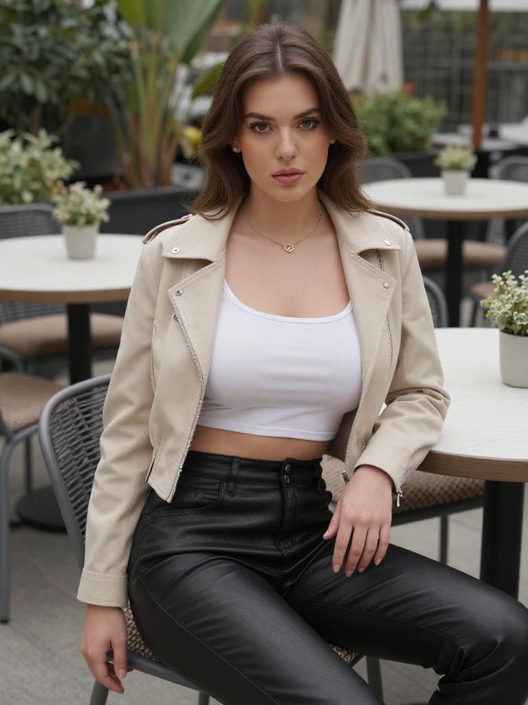 A woman in a beige moto jacket, white cropped tank top, and high-waisted black faux leather pants, captured in a pinhole camera style, seated at bistro tables in a garden patio. Sexy. Pretty face and beаutiful eyes. Big breasts