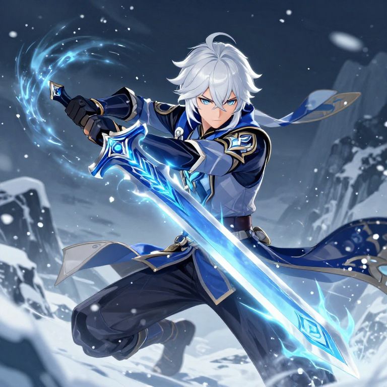 Genshin Impact white hair guy wielding a magical sword, casting icy blue elemental powers in a snowy mountain setting, sharp icy textures and glowing eyes, dynamic action pose, detailed fantasy anime art, dramatic lighting with snowflakes swirling around