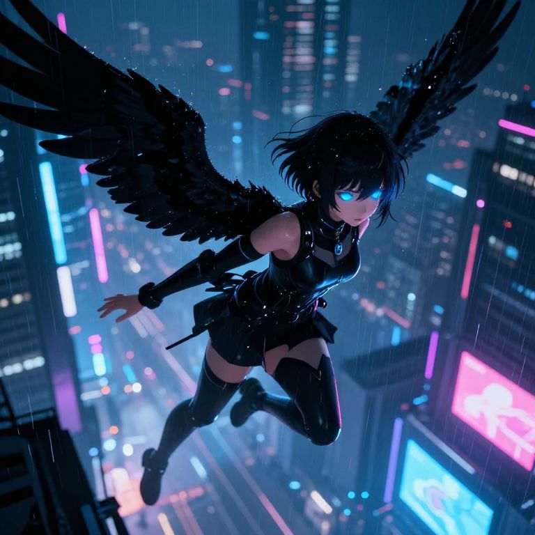 Anime girl with black wings flying over a neon-lit futuristic city at night, sleek urban outfit, glowing blue eyes, dynamic pose, cyberpunk style, high detail, intricate background, rain and reflections, vibrant and moody atmosphere.