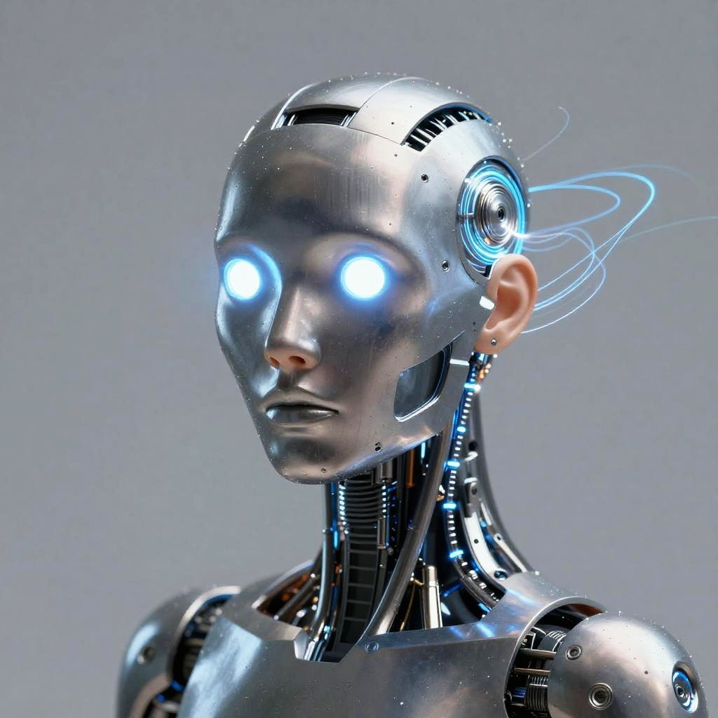 Photorealistic CGI of a shiny, silver humanoid robot with glowing blue eyes and intricate internal wiring, set against a gradient gray background.