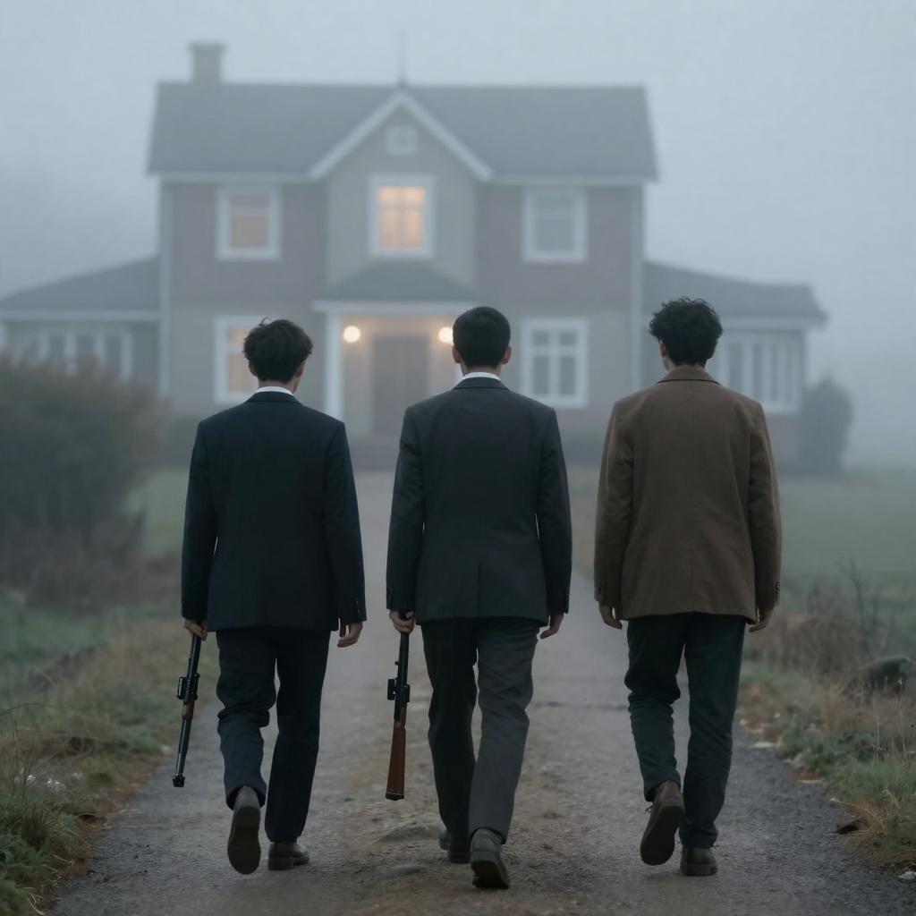 Three men walk away from the camera on a misty path. One holds a rifle. They wear dark suits and a brown jacket. A house with lit windows is in the background. Dense fog obscures the surroundings.