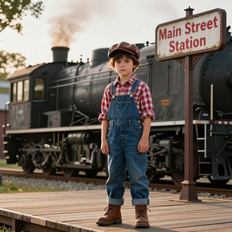 A young boy, around 8 years old, stands on a wooden platform in front of a large, vintage train station. He is wearing a red and white plaid shirt, blue overalls with pockets, a brown leather cap slightly tilted to one side, and sturdy brown boots. His dark hair is slightly messy, and he has a serious, determined expression on his face, with eyes fixed forward as if he's about to make a decision or take action. The background features a classic train with smoke rising from its engine, a faded red and white sign reading 'Main Street Station,' and a soft golden afternoon sunlight filtering through the trees. The scene is detailed, realistic, and evokes a sense of quiet anticipation and nostalgia.