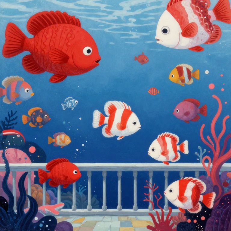 This is a vibrant digital illustration of an underwater-themed diner. Red leather booths with white tablecloths and checkered black-and-white floors are arranged in two rows. Above, a ceiling painted to mimic the ocean, complete with glowing yellow pendant lights and colorful fish like goldfish and angelfish swimming. Coral reefs and bubbles add to the underwater effect. The walls are lined with more coral and aquatic plants. Small red and white condiment bottles and napkins are placed on each table. The overall style is whimsical and colorful, blending retro diner aesthetics with a playful underwater theme.
