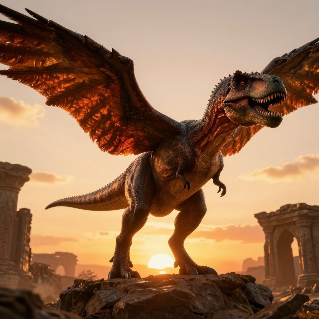 Photorealistic CGI: A fierce, massive T-Rex with sharp teeth lunges at a woman in a flowing dress, standing in a desert at