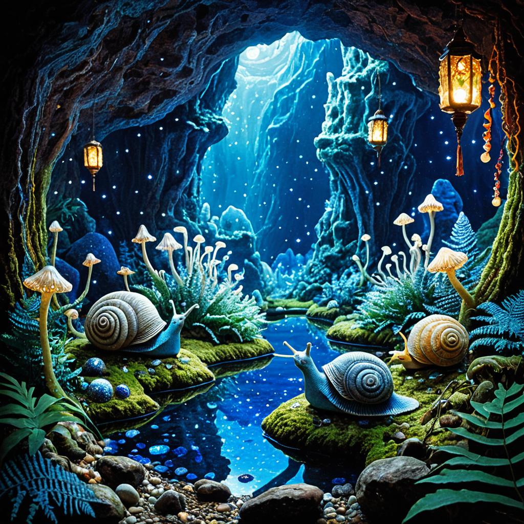 Surreal fantasy scene inside an azure crystal cave illuminated by twinkling lights and glowing lanterns. Two terracotta-inspired slug and snail creatures rest on moss-covered rocks beside a shallow pond filled with luminous stones. The environment features ivory-colored twinkle-lace moss patches, reef-like halo ferns, and hanging glowing lanterns, creating a mystical and detailed deep fantasy escapade.