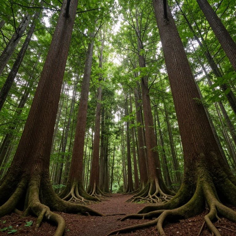 Photograph of a dense, lush redwood forest with towering, thick-trunked trees stretching skyward. The trunks, covered in textured, reddish-brown bark, display large, gnarled roots sprawling across the forest floor. Sunlight filters through the vibrant, green canopy, casting dappled light and shadow. The forest floor is covered in a layer of brown, dry leaves and a narrow, winding dirt path leads deeper into the woods. The overall atmosphere is serene and majestic, with a strong sense of vertical perspective created by the tall trees.