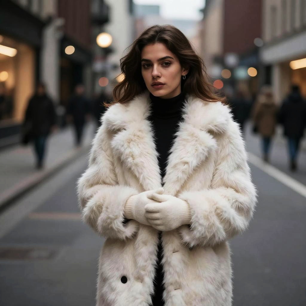 White Fur Coat Halloween, woman in a furry coat and gloves standing on a city street --sref 1407