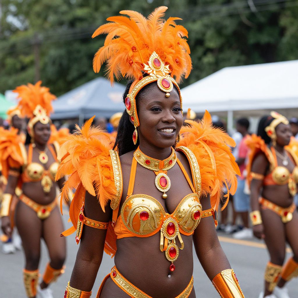 Photograph of a smiling woman of African descent at a vibrant parade. She's wearing a bright orange feathered headdress, elaborate gold and orange breastplate adorned with red gems, and matching arm cuffs. Her dark skin contrasts with the vivid orange feathers and gold jewelry. In the blurred background, other performers in similar costumes are visible, along with white tents and green trees. The scene is lively and colorful.