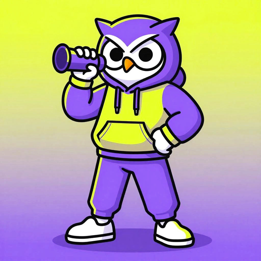 Realistic photo. A vibrant cartoon illustration of a holographic owl beatboxer at cyberpunk neon-lit street, bold black outlines, clean cel shading, crisp cutout edges; oversized hoodie, tapered joggers, slip-on shoes, cap and wristbands. Relaxed, expressive pose, confident tilt, exaggerated proportions, chunky silhouette; modern, slightly abstract shapes, minimal clutter; simple gradient backdrop, tidy shadows, soft rim light. Dominant electric violet and lime yellow with high-contrast accents; playful retro hip-hop vibe, halftone speckles, subtle paper grain.