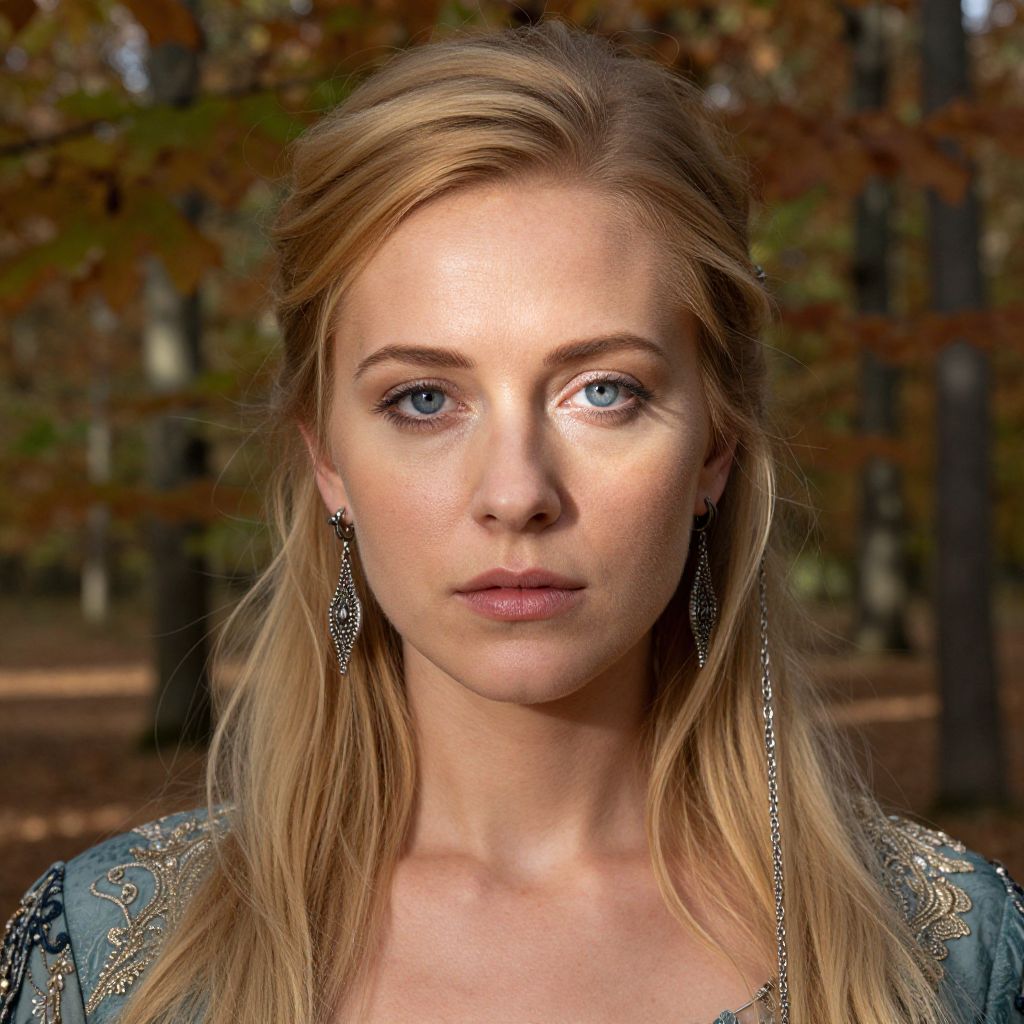 A photograph of a fair-skinned, blonde woman with blue eyes, wearing a teal garment with intricate gold embroidery. She has long, straight hair parted in the middle and wears long, dangling silver earrings. The background is a blurred forest with autumn-colored leaves and tall trees, creating a warm, natural ambiance. Her expression is neutral, and the lighting highlights her facial features and hair. The image has a realistic, high-definition style.