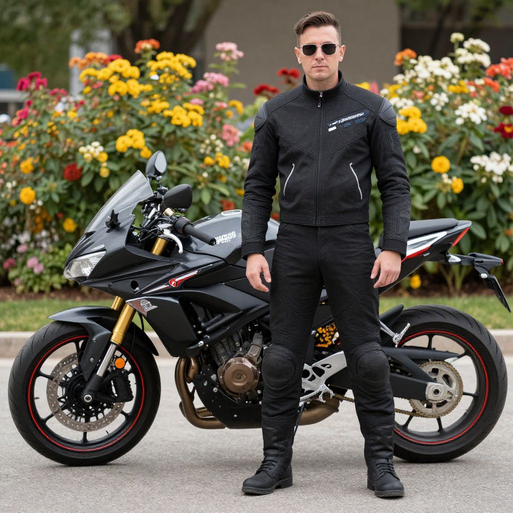 Photograph of a Caucasian man with short brown hair, wearing black sunglasses, a black leather motorcycle jacket with white stitching, black pants, and black boots. He stands confidently in front of a sleek black sport motorcycle with gold suspension forks and red-rimmed tires. The background features a vibrant garden with colorful flowers in yellow, red, pink, and white, and blurred greenery. The man's jacket has a white logo on the left chest, and the motorcycle has a visible headlight and brand logo on the fairing. The scene is outdoors on a paved surface.