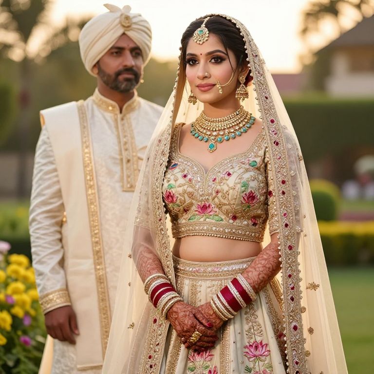 A detailed wedding-style photo of a radiant bride in her early 30s with soft pink skin and large, expressive eyes, dressed in a traditional Banarasi lehenga blouse with lotus motifs and gold thread embroidery, standing beside a vintage ivory-colored dhoti in a golden-hued garden during a summer sunset.