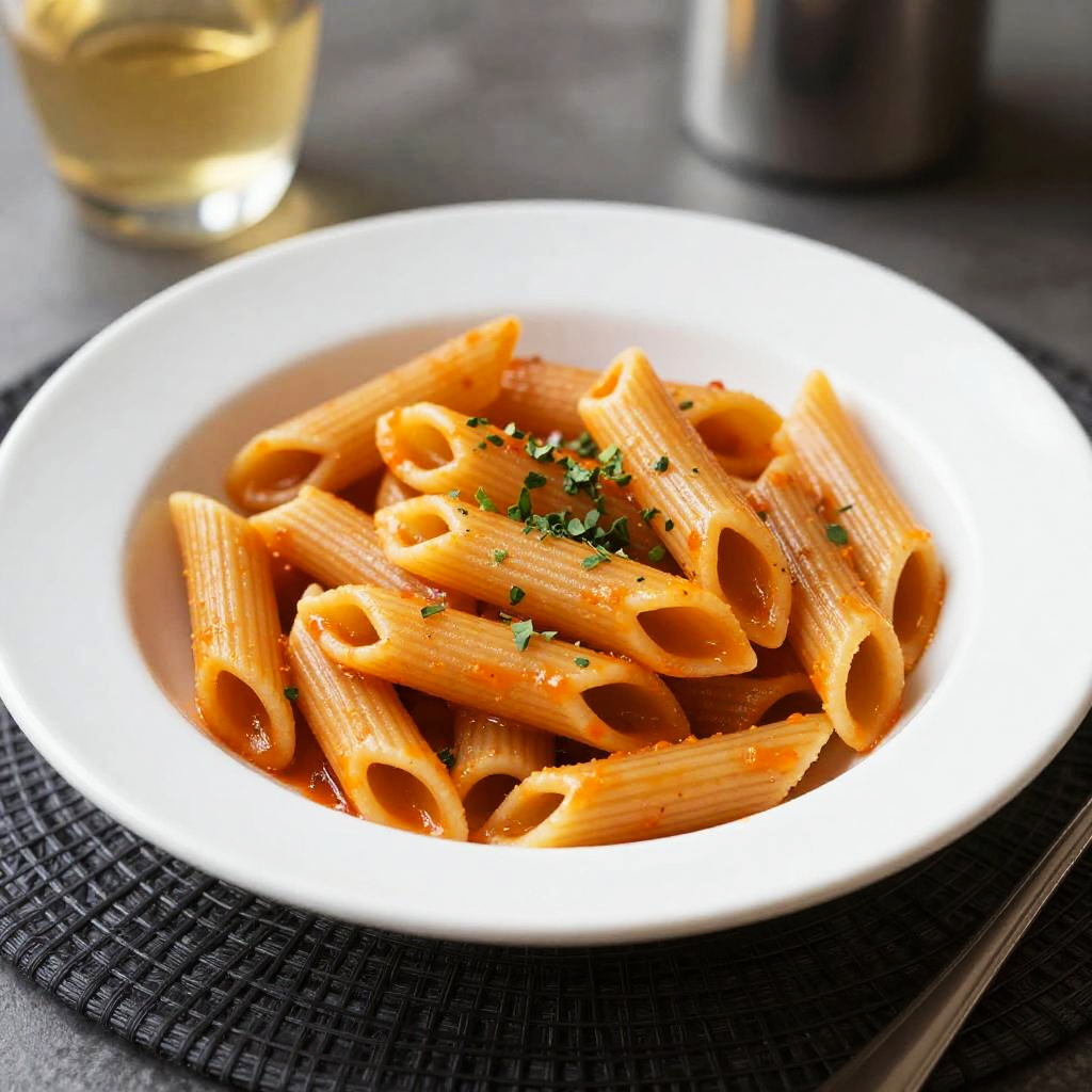 Photograph of a white ceramic bowl filled with orange-glazed penne pasta, garnished with chopped herbs. The bowl is centered on a dark, textured placemat with a silver fork to the right. In the blurred background, there's a glass with a golden liquid and a metallic container. The lighting is bright, emphasizing the pasta's glossy texture.