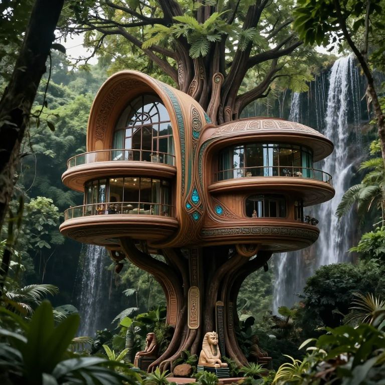 The image depicts an ultra-modern, futuristic treehouse structure nestled amidst a dense, lush forest. The treehouse, with its art nouveau-inspired shapes and Arabic ornaments, stands out with its sleek, curved lines and intricate details. The building features multiple levels, each adorned with glass windows and balconies, allowing for a seamless integration with the surrounding greenery. The structure is elevated on stilts, blending seamlessly with the natural environment, and is surrounded by towering trees and cascading waterfalls. The overall composition is balanced, with the treehouse positioned centrally, creating a harmonious balance between the man-made and natural elements. The lighting is soft and diffused, enhancing the tranquil and serene atmosphere of the scene. The colors are predominantly earthy tones, with shades of green from the foliage and warm browns from the treehouse, creating a cohesive and visually appealing palette. The intricate details, such as the Sphinx-like figures and ancient Egyptian pylons and steles, add a touch of historical and cultural significance to the futuristic design. The cinematic lightning in the background further enhances the dramatic and otherworldly feel of the scene.