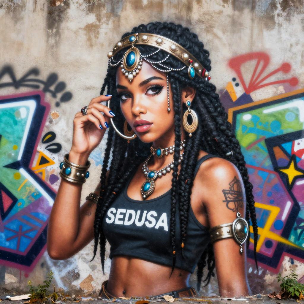 A vibrant photograph of a young Black woman with dark brown skin and long, intricately braided hair, adorned with a gold headpiece featuring turquoise gems and matching earrings. She wears a black crop top with "SEDUCA" in bold white letters, silver bangles, and a necklace with turquoise pendants. Her left arm displays a tattoo. She gazes confidently at the camera with a slight smile, touching her face with her right hand. The background is a colorful, graffiti-covered wall with bold, geometric patterns. The image has a textured, digital art overlay, adding a layered, artistic effect.