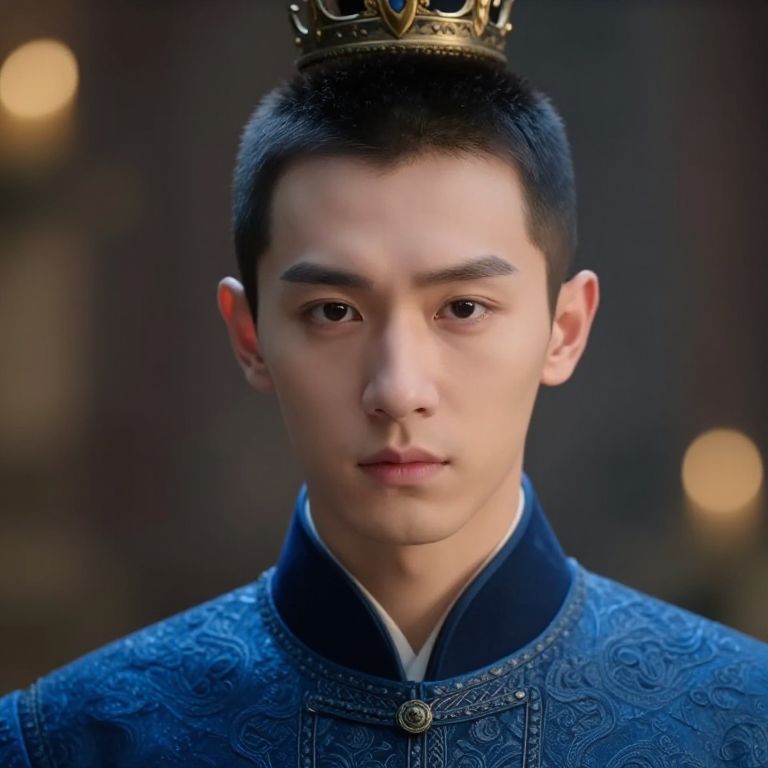 Photograph of an Asian man with short black hair, wearing a golden crown and intricate blue embroidered robe, staring seriously. Blurred warm background.