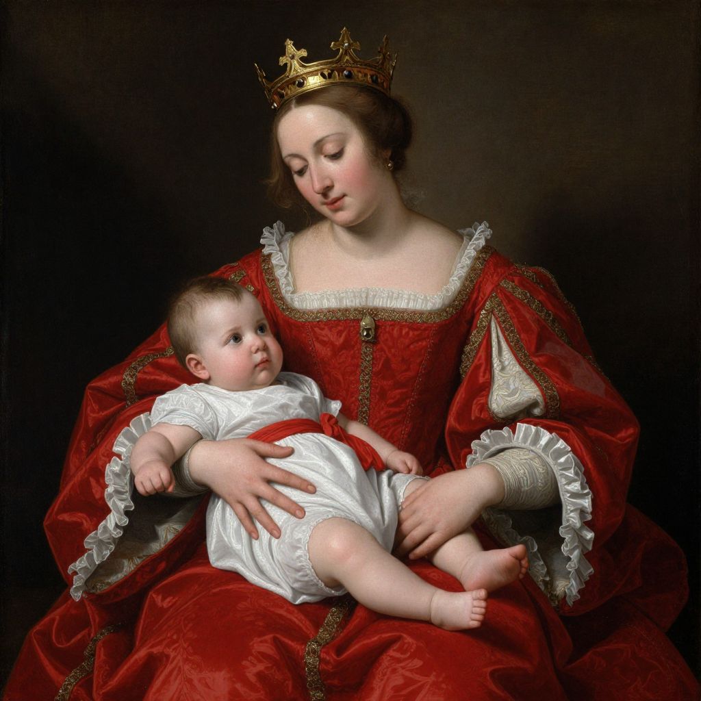 Renaissance-style painting of a fair-skinned queen with brown hair, gold crown, red velvet gown, holding a fair-skinned baby in white