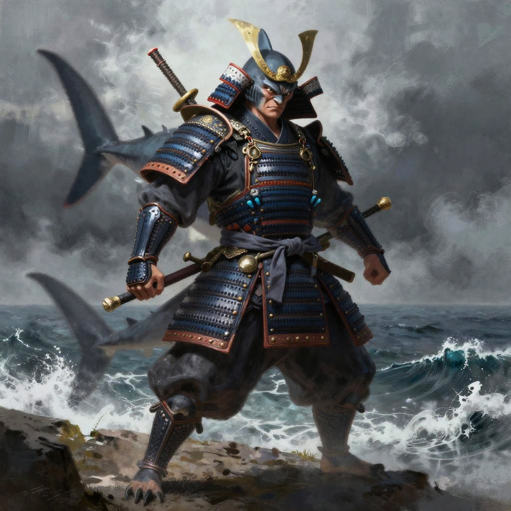 Digital artwork of a fierce samurai standing on rocky shore with turbulent ocean waves in the background. He wears traditional dark blue and black armor with gold and red accents, a large helmet adorned with a blue crest, and holds two swords. Two large, gray fish-like creatures fly behind him, adding a supernatural element. The sky is cloudy and stormy, enhancing the dramatic atmosphere. The samurai's expression is determined, and his stance is strong and defensive. The image combines realistic textures with fantasy elements, creating a dynamic and epic scene.