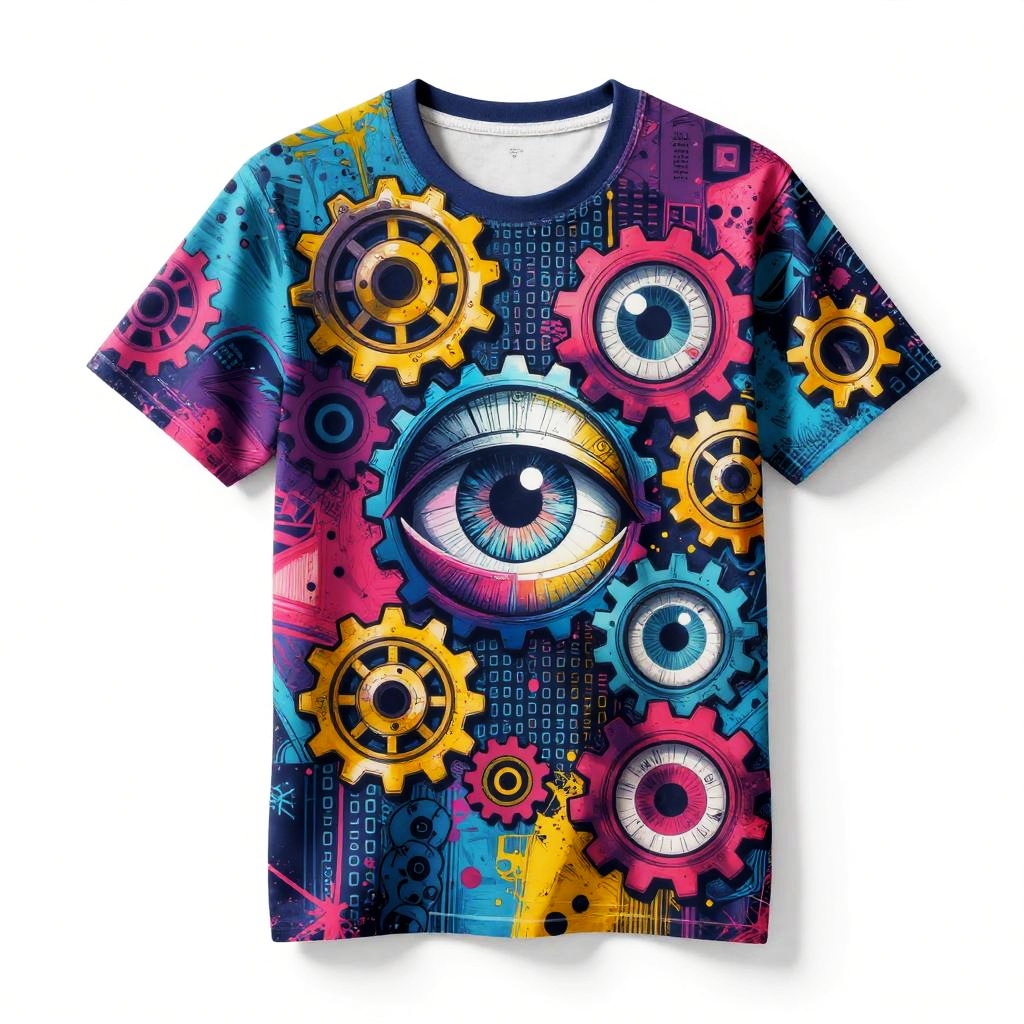 AI t-shirt design generator free, dynamic collage of AI-related symbols like gears, binary code, and digital eyes merging into a colorful graffiti-style street art motif, vivid brush strokes and splatters, urban fashion inspired, stylish and energetic apparel graphic