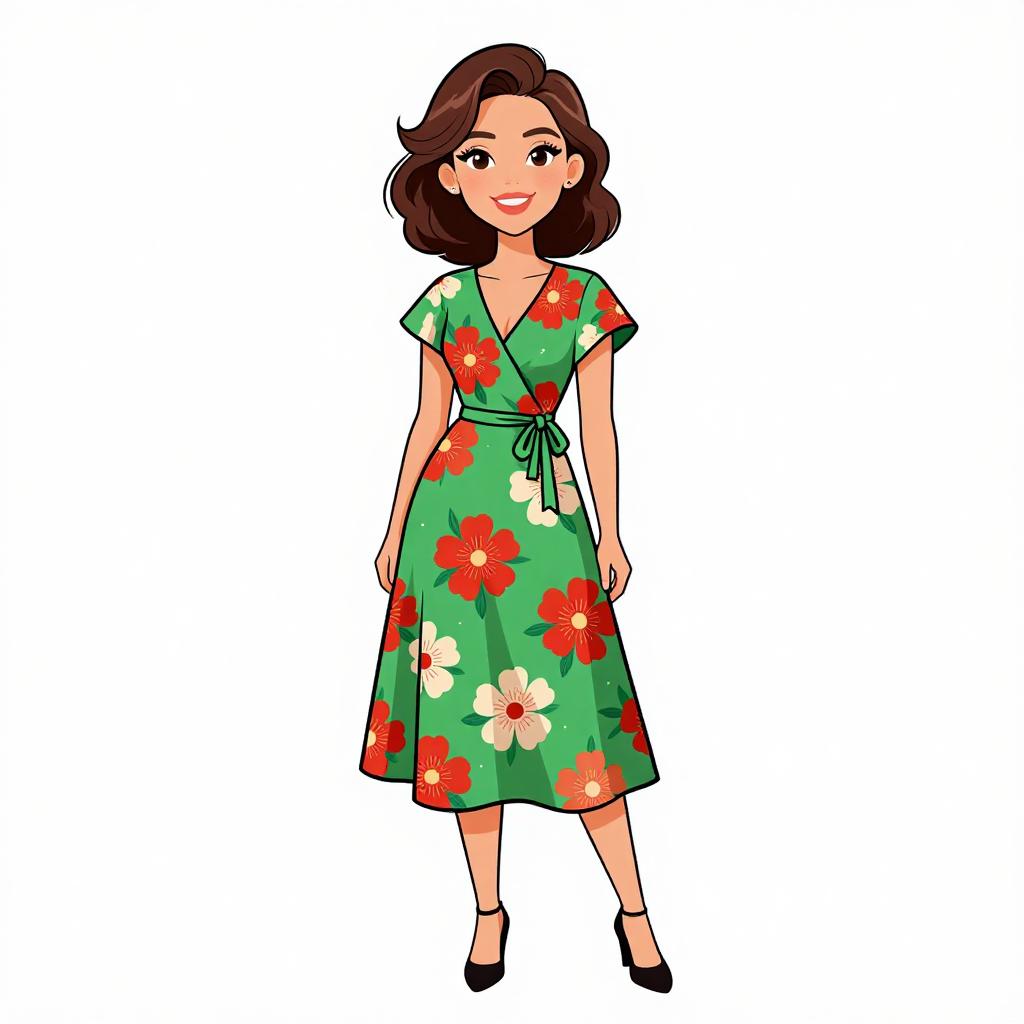 Woman with pretty face and pretty hair. smiling Woman, vintage-inspired, floral print midi dress in shades of red and green, V-neckline, short flutter sleeves, A-line silhouette, cinched waist with a subtle tie-back detail, calf-length hem, minimal nude strappy heels, plain white studio background. --sref 1467