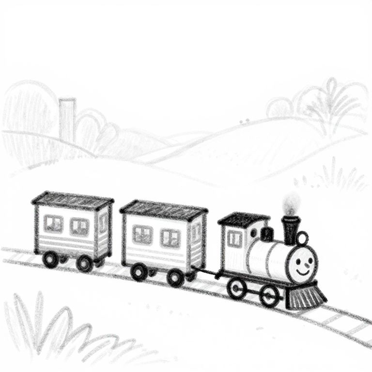 Easy train drawings illustrated with crayon texture, depicting a small train with three carriages chugging along, smiling face on the engine, rustic countryside background lightly sketched, emphasizing fun and simplicity