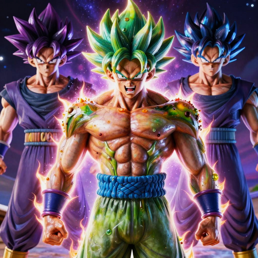 Digital artwork depicting three muscular, anime-style male characters with spiky hair. The central figure, with green, glowing hair and a fierce expression, is shirtless, showcasing a well-defined, glowing, electrified chest and arms. He wears green pants with a blue waistband. Flanking him are two characters with dark, spiky hair in purple and blue tones, both wearing dark purple, sleeveless tops with black pants and golden belts. The background is a cosmic, starry space with vibrant purple and blue hues, enhancing the dramatic, glowing effect around the central character. The overall style is vibrant and dynamic, with high contrast and energy.