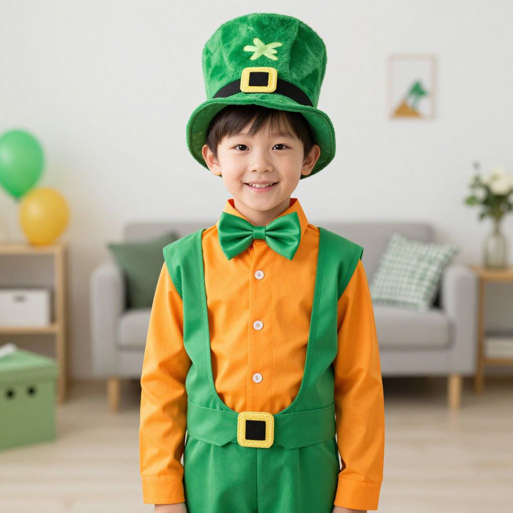 Patricks Day Costume Boy, boy in green and orange outfit with a green hat and a green bow tie