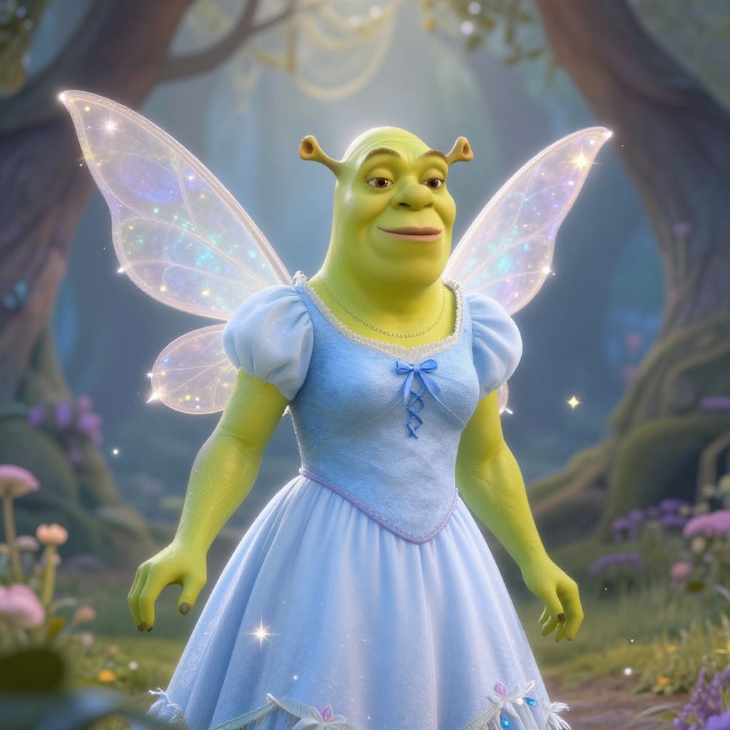 Fairy godmother in Shrek universe wearing an elegant blue dress, surrounded by magical sparkles and glowing light, enchanting a mystical forest background, soft pastel color palette, delicate fairy wings shimmering, whimsical and enchanting atmosphere